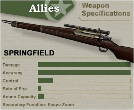 The M1903 Springfield is a bolt-action sniper rifle in both games. It is only available to the American team.